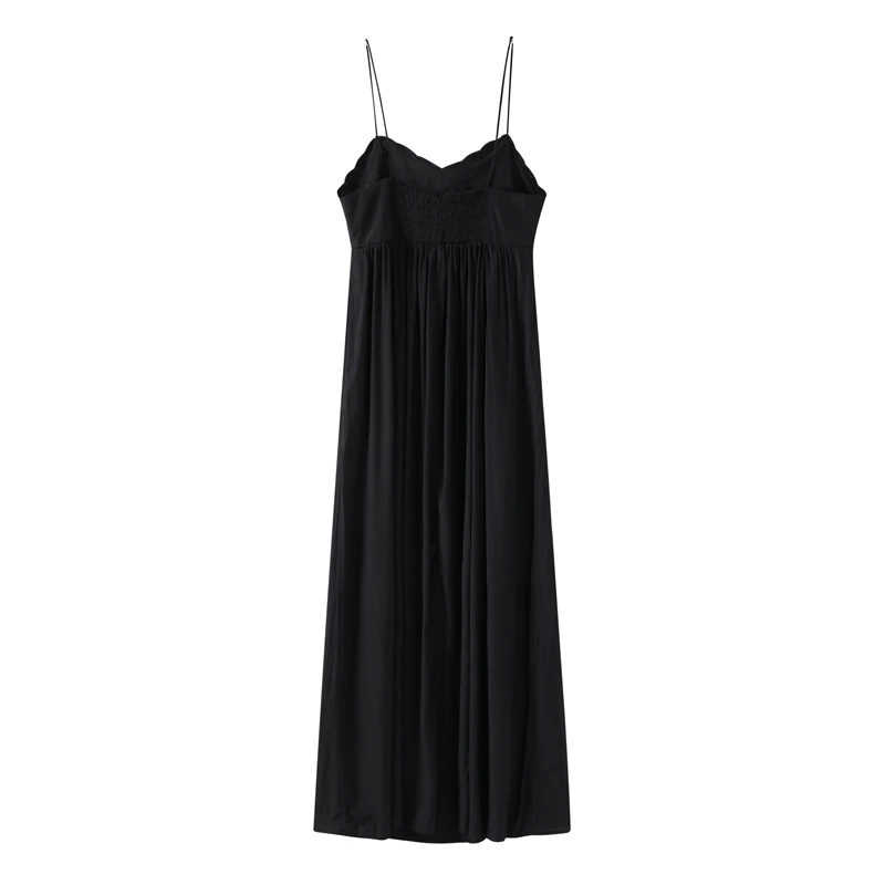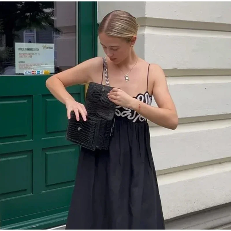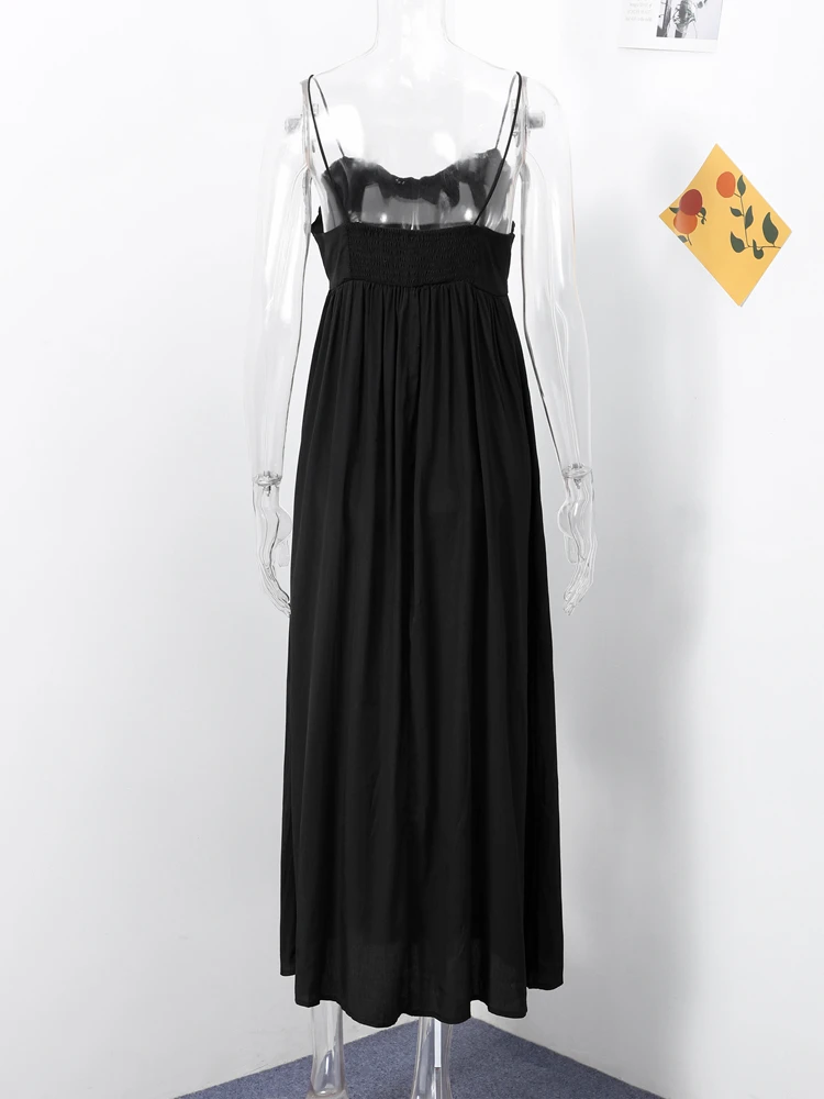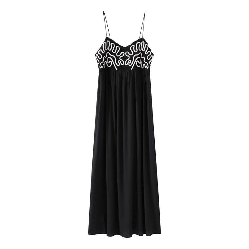Fashion Embroidery Sling Long Dress Women 2024 Elegant V-Neck Sleeveless Backless Pleated Midi Dress Summer Vacation Beach Robes