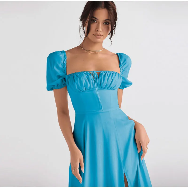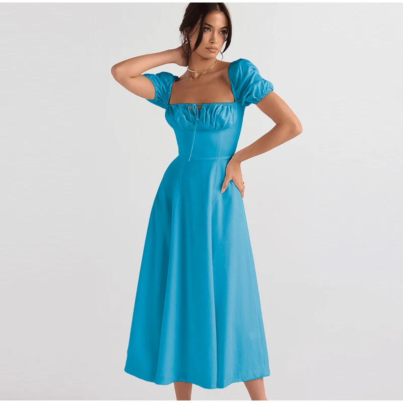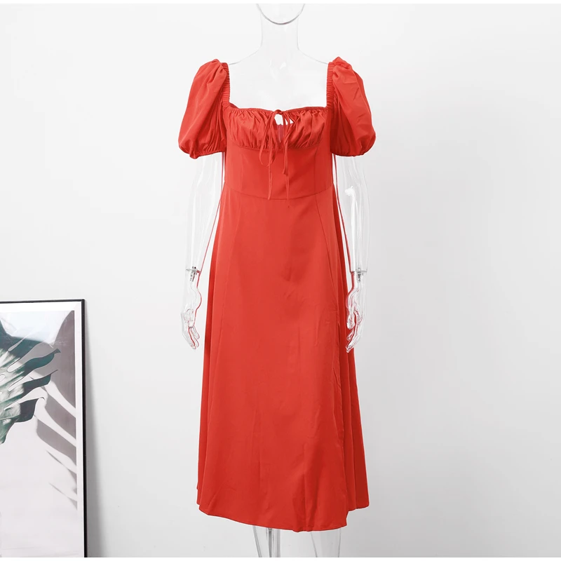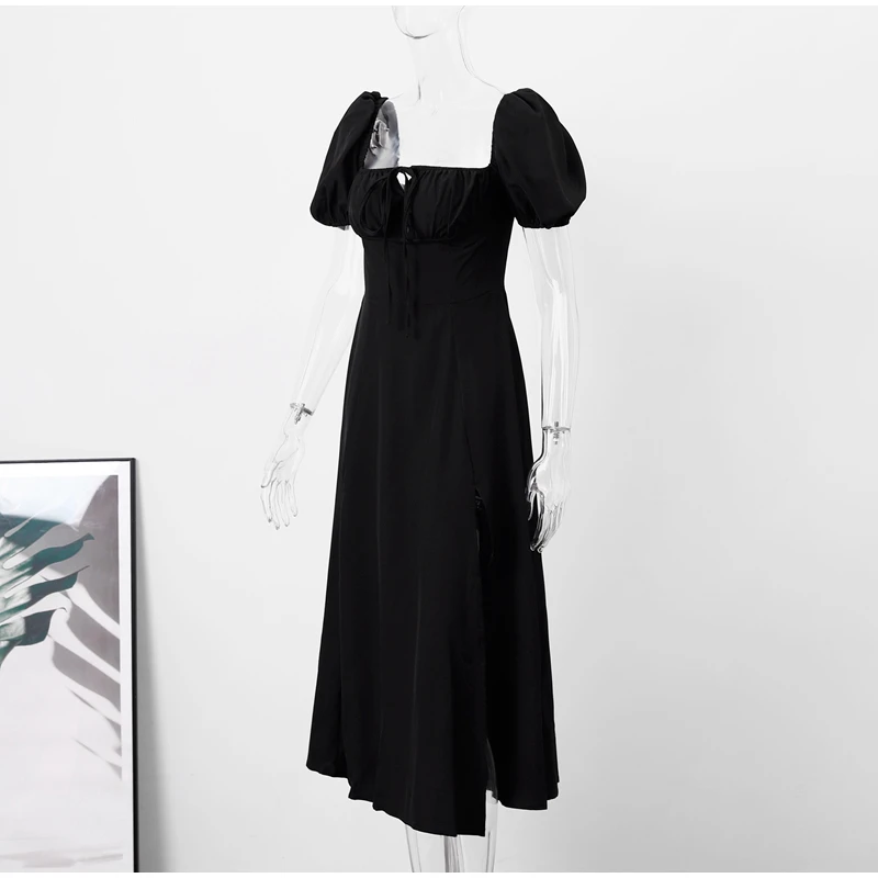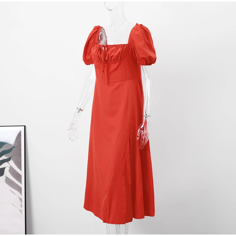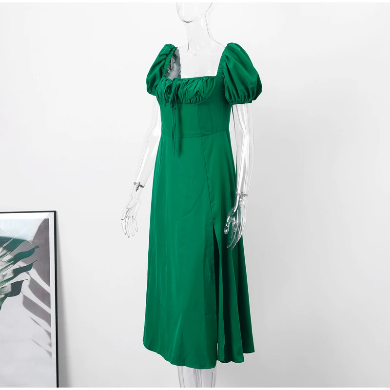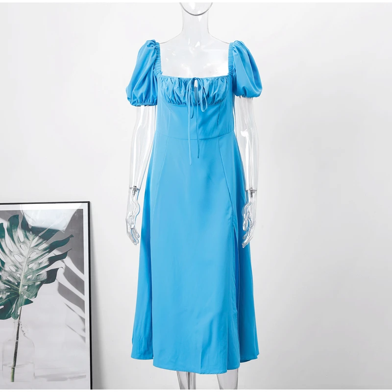 Elegant shoulder Solid Dress Women Summer High Split Bandage Ruched Midi Female Dresses Short Sleeve A-line Lady Robe
