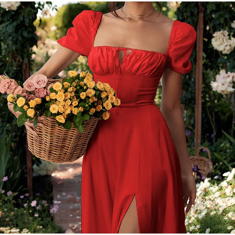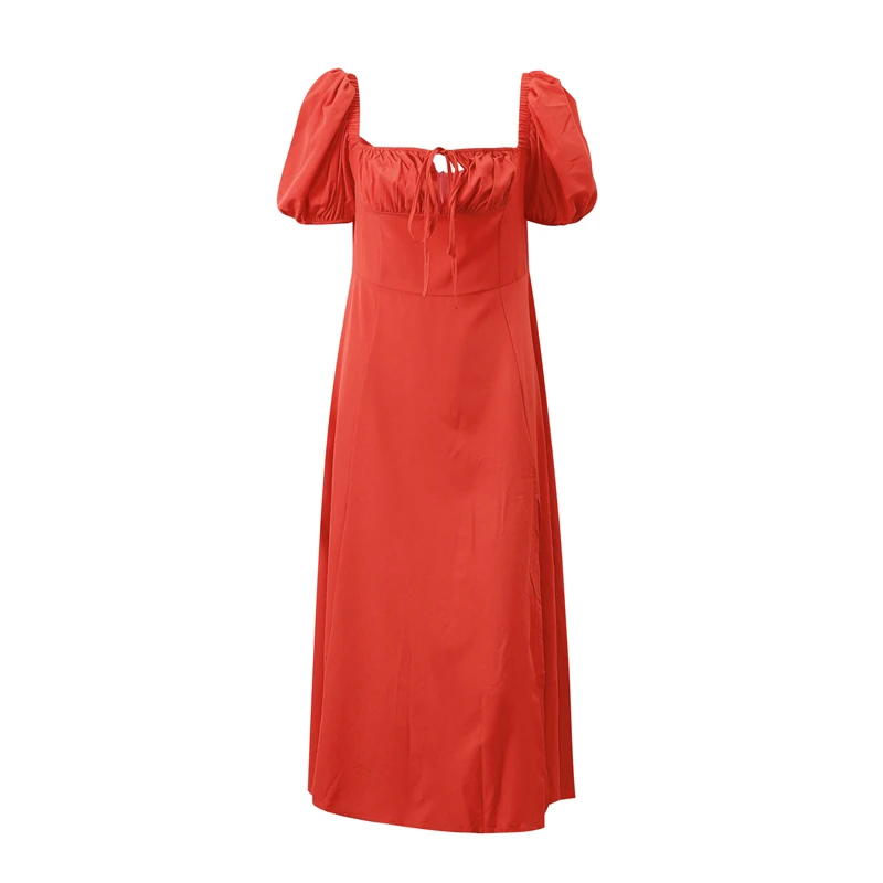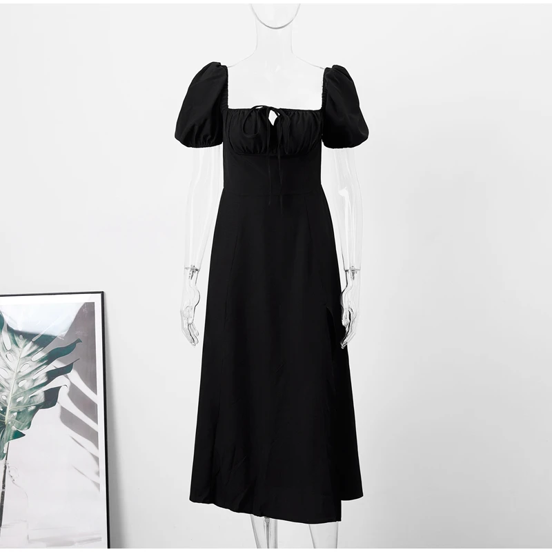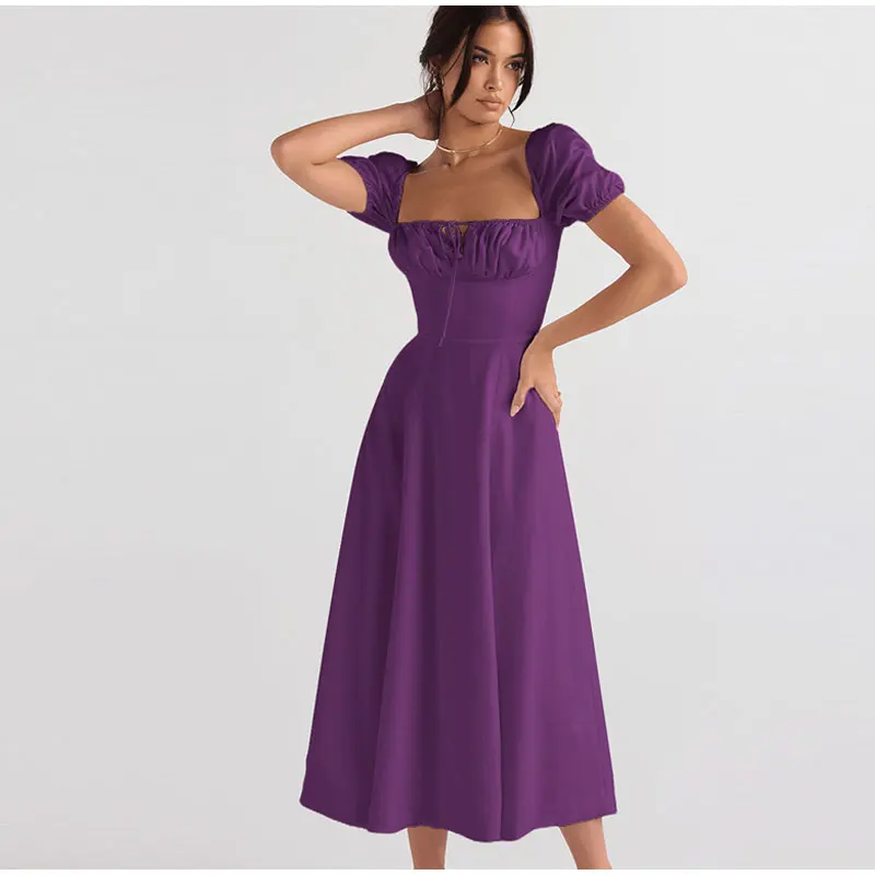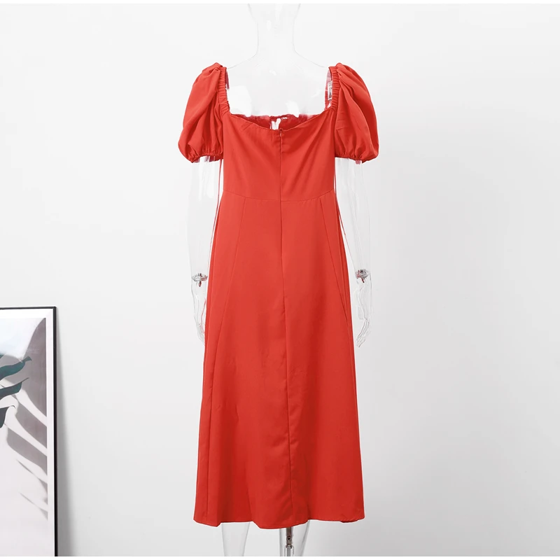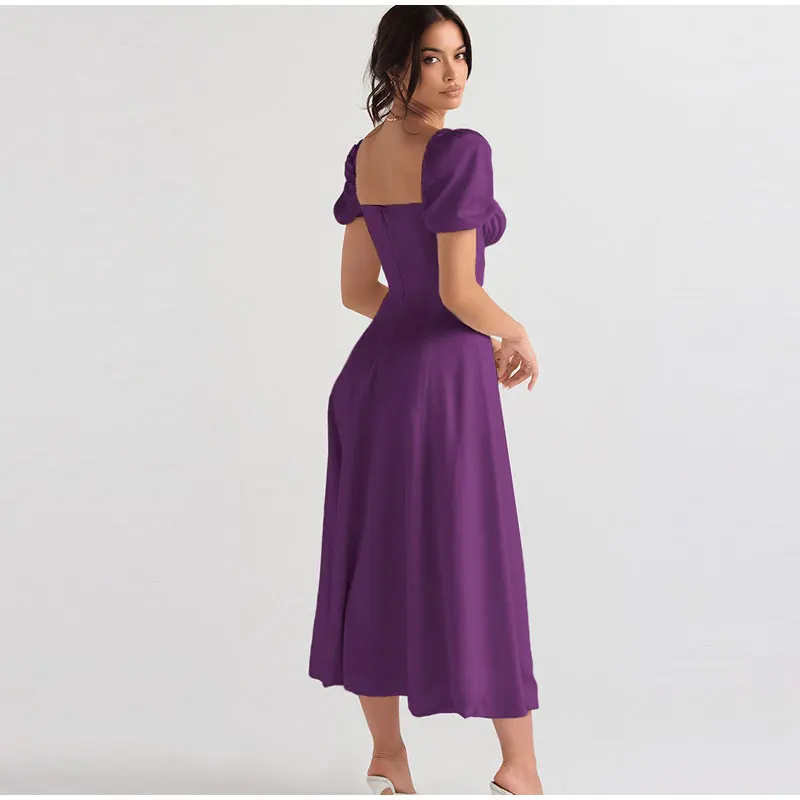 Elegant shoulder Solid Dress Women Summer High Split Bandage Ruched Midi Female Dresses Short Sleeve A-line Lady Robe