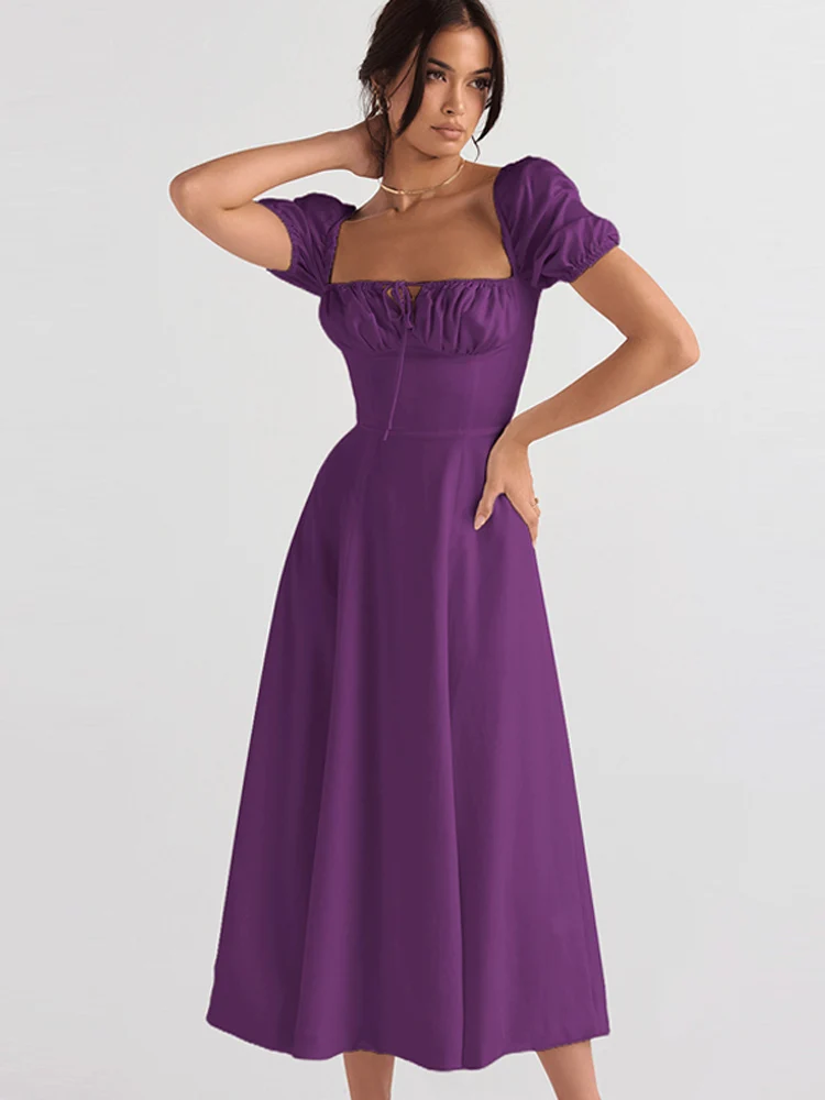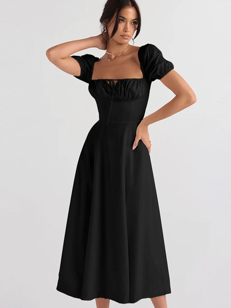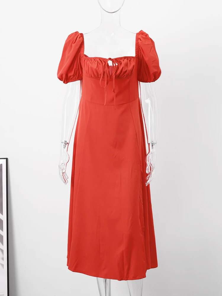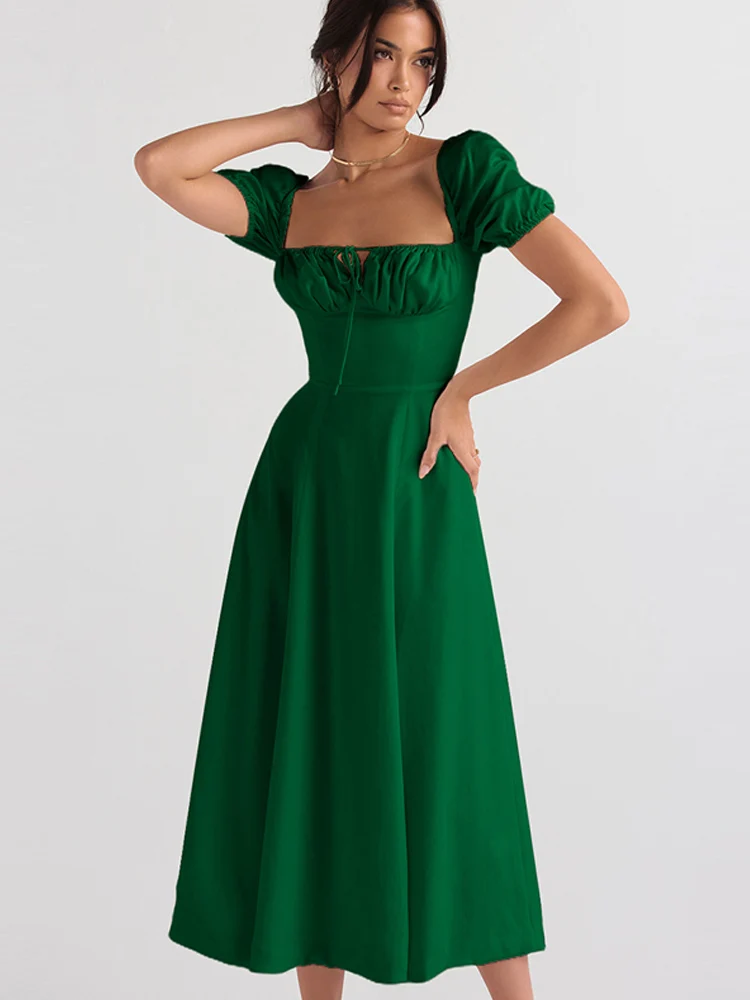 Elegant shoulder Solid Dress Women Summer High Split Bandage Ruched Midi Female Dresses Short Sleeve A-line Lady Robe