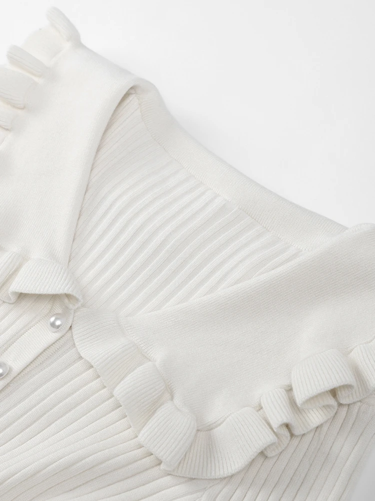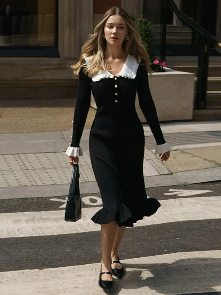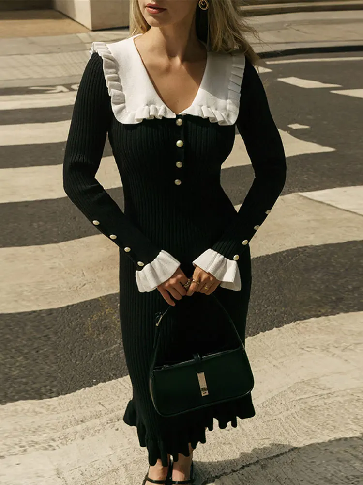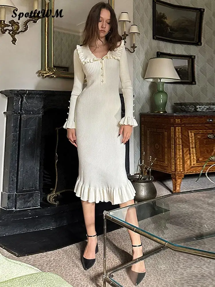 Women Elegant Ruffled Sweater Dress Sexy Long Sleeve Button Slim Knitted Midi Dresses Autumn Winter 2023 Vintage Party Vestido