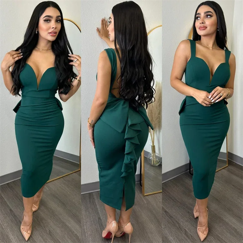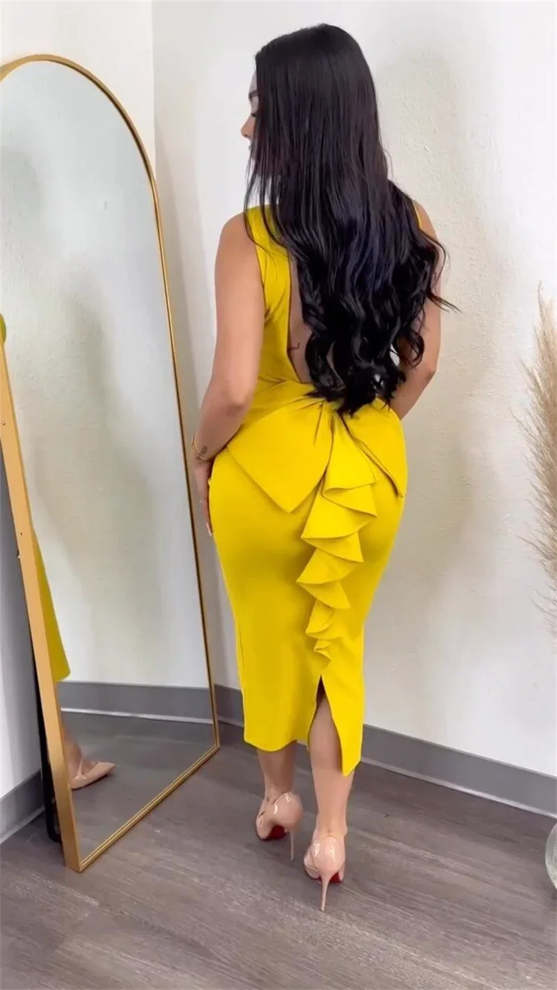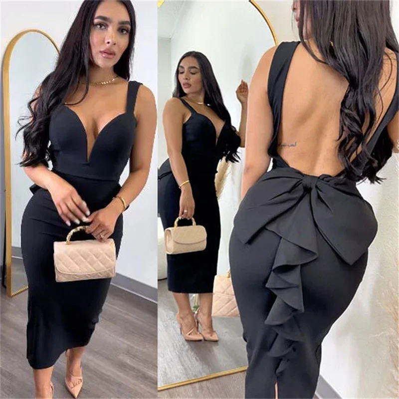 Sexy Plunging V-neck Backless Bowknot Ruffles Bodycon Midi Dresses for Women Party Night Elegant Club Celebrity Prom Dress Robes